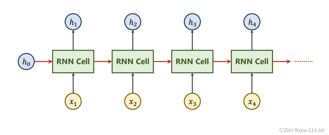 - 红色箭头:表示隐藏状态在时间步之间的传递,这是RNN的核心机制